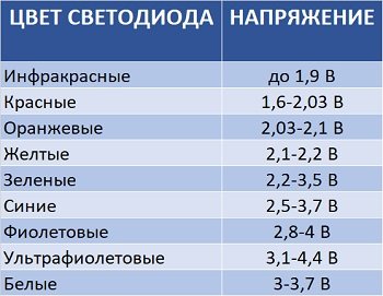 [stextbox id=’info’]Светодиоды отличаются по длине волны – они способны точно испускать свет определённого спектра, в частности, ультрафиолетовыми светодиодами можно засвечивать фоторезист, а фидосветодиоды ускоряют рост растений. Граничное напряжение светодиода меняется от 1.9 В (инфракрасный) до 3.7 В (белый). Часто светодиоды собирают в последовательные сборки (например, в дешёвых светодиодных лентах), чтобы запитать, например, 5 2.2-вольтовых светодиодов от 12В, потеряв всего 1В на резисторе.[/stextbox]