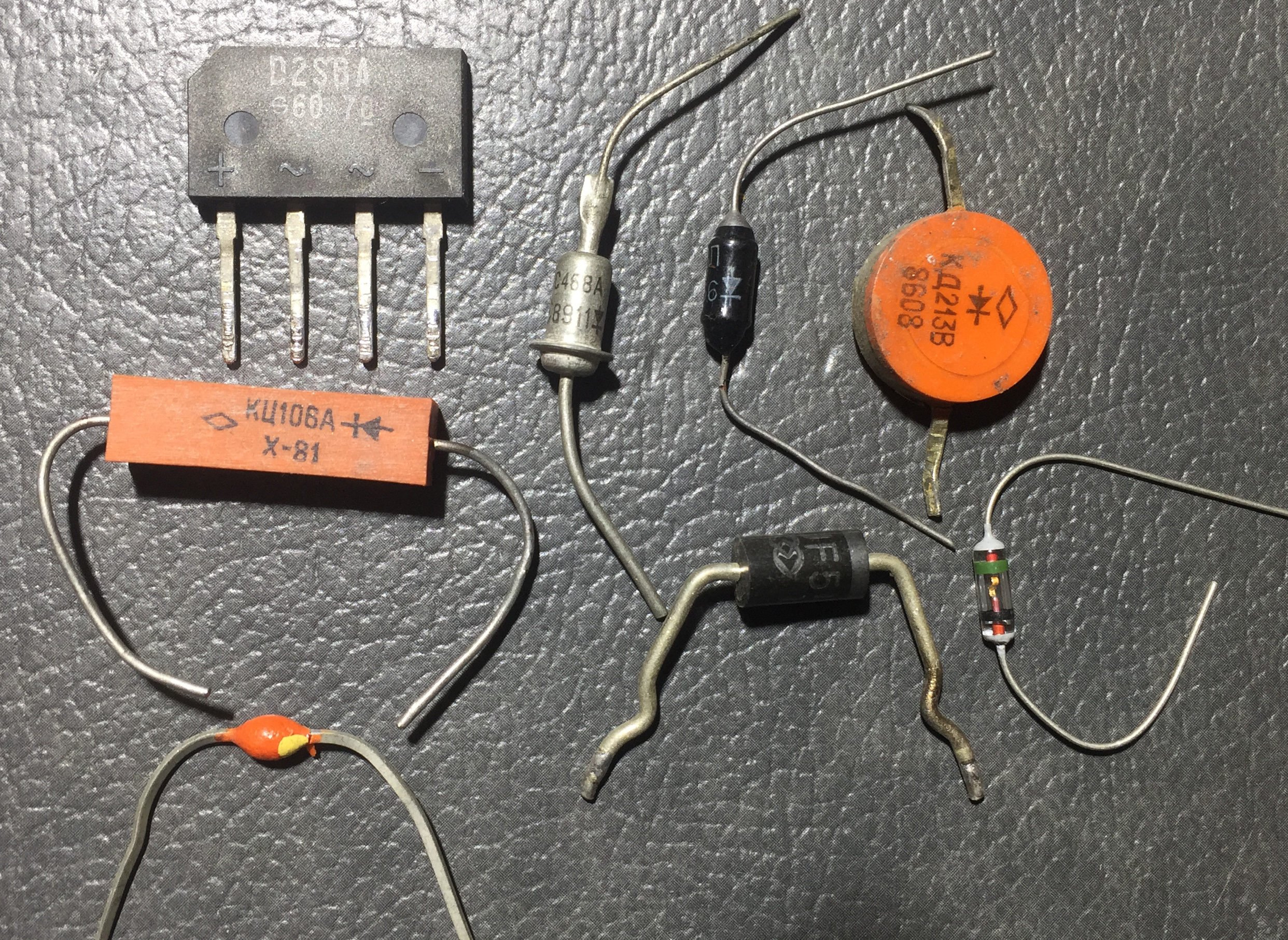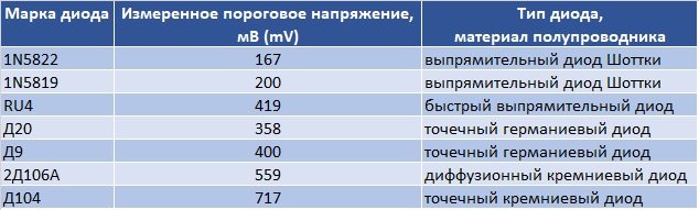Вот небольшая подборка, составленная из конкретных диодов и соответствующих им величин Vf, которые были получены при их тестировании мультиметром. Все диоды были предварительно проверены на исправность.