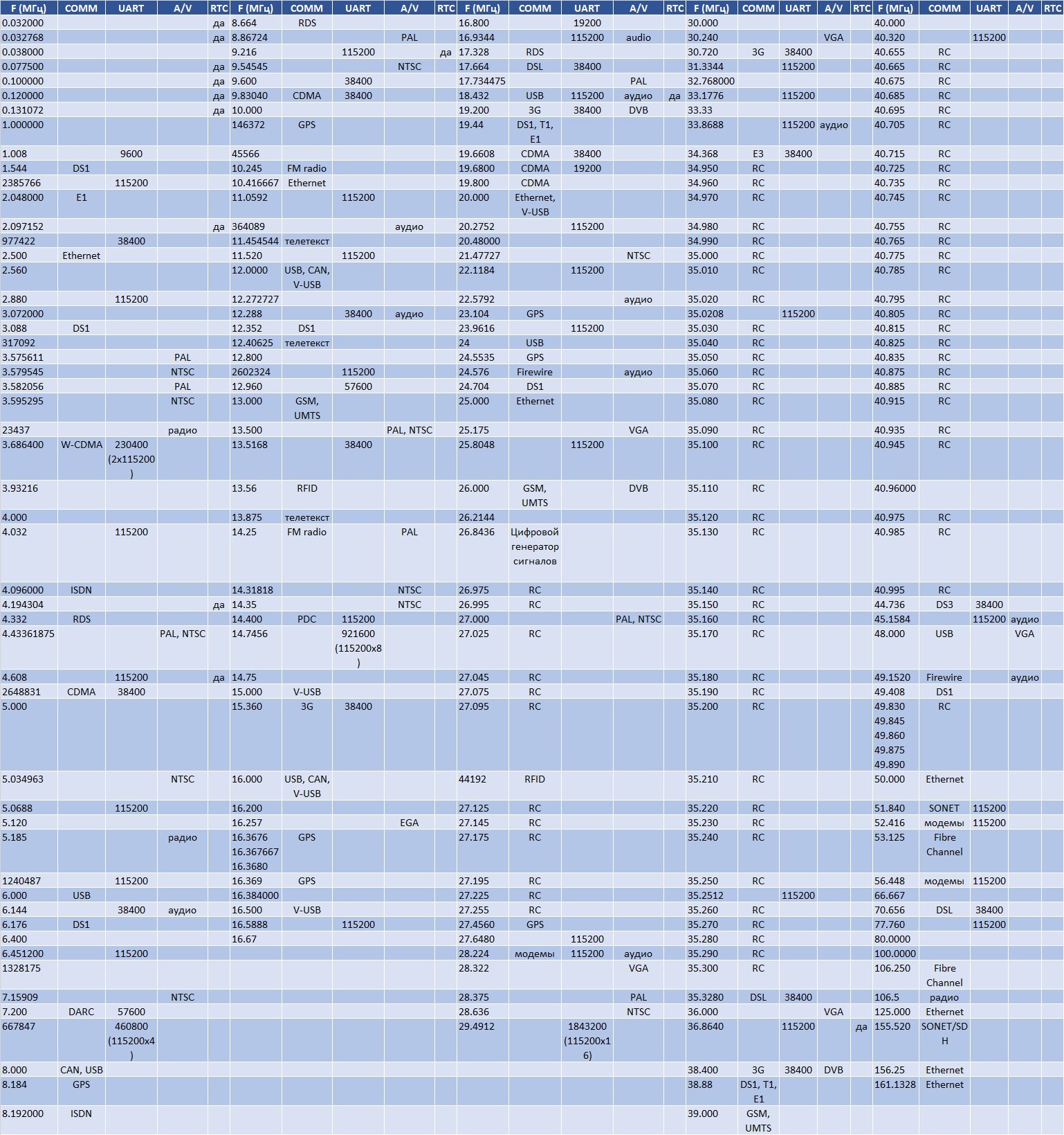 Механическая система, в которой закрепляется кварцевый элемент и которая несет элементы конструкции, необходимые для возбуждения кварца, носит название кристаллодержателя. Если на электроды, между которыми помещен кварцевый элемент, подается переменное электрическое напряжение, то механические напряжения и деформации в кристалле также будут переменными, и при частоте переменного электрического напряжения, равной частоте собственных механических колебаний кварца, возникает механический резонанс. При этом на гранях кварцевого элемента, а следовательно, и на электродах кристаллодержателя появляются переменные заряды, величина и фаза которых определяются комплексной амплитудой механических напряжений в кристалле. Полная таблица частот кварцевых резонаторов представлена в таблице ниже (кликабельна для увеличения).